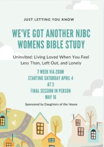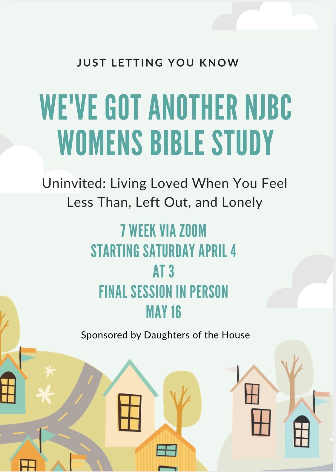 NJBC Women’s Bible Study! It is entitled – Uninvited: Living Loved When You Feel Less Than, Left Out, and Lonely. This will be a 7- week virtual series (via Zoom) starting Saturday, April 4 at 3pm with the final session in-person on Saturday, May 16. We are encouraging all Daughters of the House to register for this time to learn, grow, and fellowship together in God’s Word!
