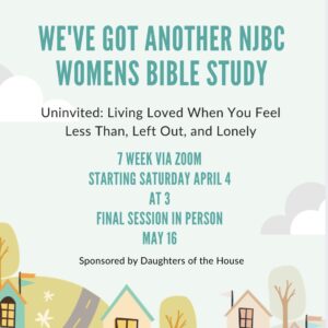 NJBC Women’s Virtual Bible Study NJBC Women’s Bible Study! It is entitled – Uninvited: Living ... 19 Apr 4:00 pm